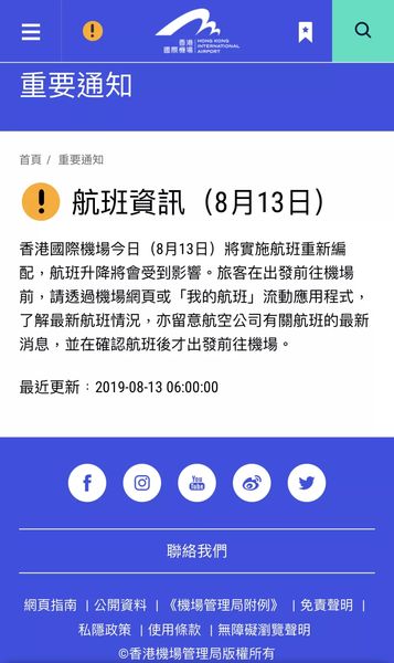 8月13日早6点,香港机场管理局在官网上发布消息称,13日,香港国际机场将实施航班重新编配,航班升降将会受到影响。根据其网页显示,当天仍有多个航班处于“取消”状态。机场管理局提醒旅客在出发前往机场前,需通过机场网页或者“我的航班”手机应用程序,了解最新的航班情况,以及各航空公司有关航班的最新消息,并在确认航班后再出发前往机场。