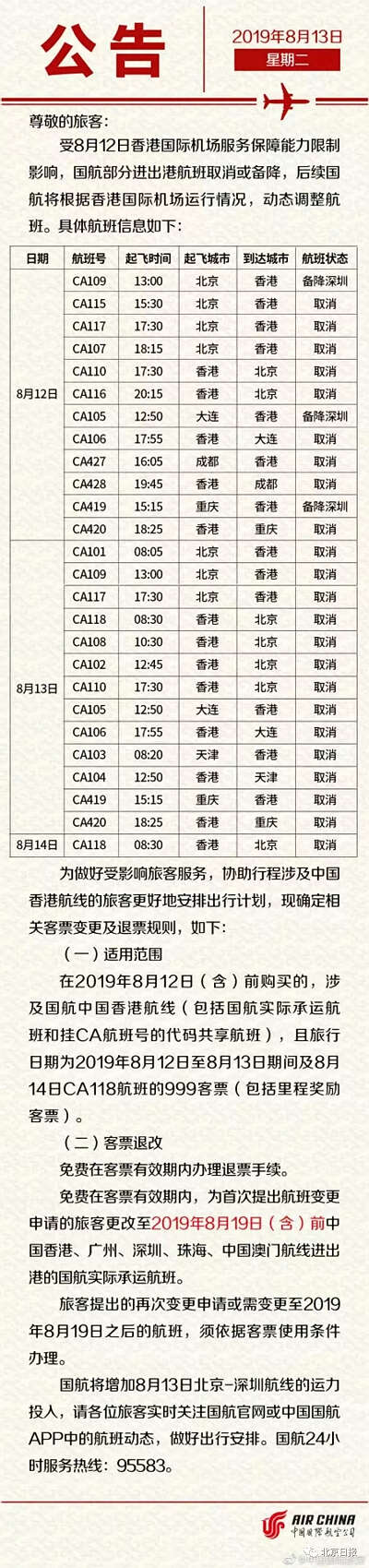 13日晨,中国国际航空公司发布关于香港机场航班调整和客票退改的通知: