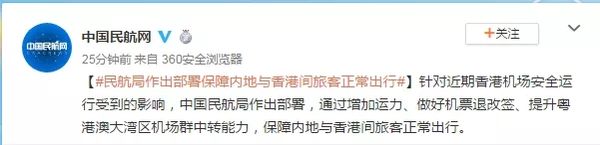 针对近期香港机场安全运行受到的影响,中国民航局作出部署,通过增加运力、做好机票退改签、提升粤港澳大湾区机场群中转能力,保障内地与香港间旅客正常出行。
