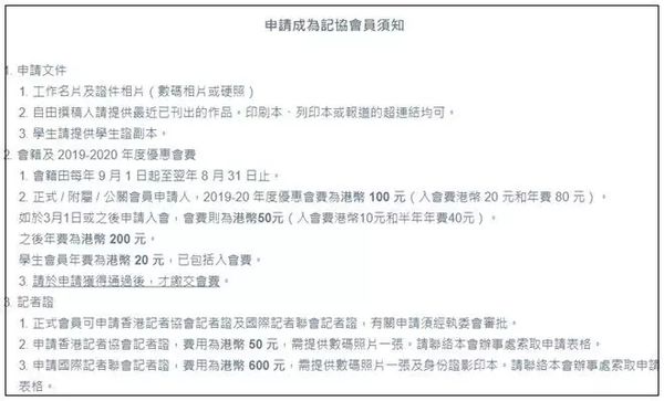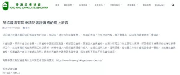 这份声明称,加入香港记者协会还需要经过其他会员介绍,并通过协会的执行委员会审批才可以——尽管这一要求并未被写入其官网上入会所需的申请材料中。