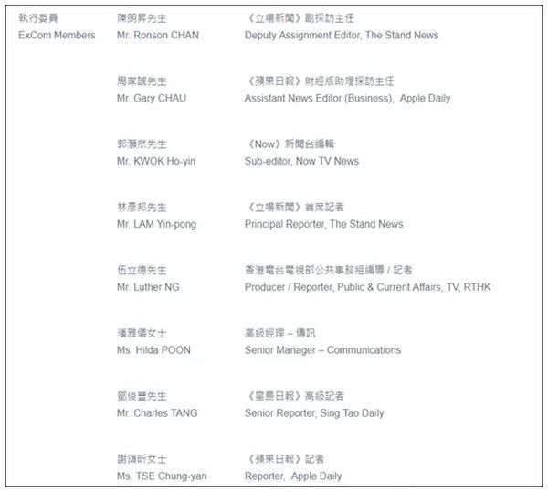 但当我们进一步查询这个“香港记者协会”的“执行委员会”名单时,却发现了很有趣的内容:这帮握有可以批准让谁入会、以及谁获得“记者证”的人,绝大多数都来自同一个政治立场的媒体。