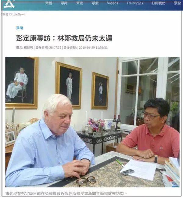 更荒诞的是,身为香港记者协会主席和“众新闻”主笔的杨建兴,还跑去“专访”了末代港督彭定康,让这个英国殖民者去对香港特区政府甚至“一国两制”指手画脚。这篇报道中还有不少妖魔化内地的内容。