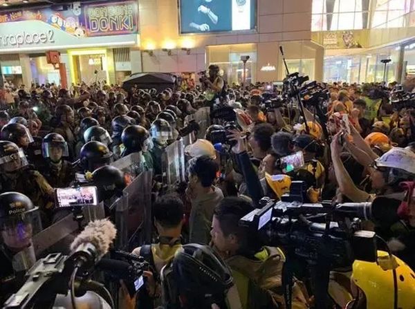 可每当香港警察要对这些暴徒执法的时候,总会有一群身穿黄色荧光马甲、上面还写着“记者”二字的人挡在警察和暴徒之间,并挥舞着他们手中的手机或照相机,阻拦警察执法。