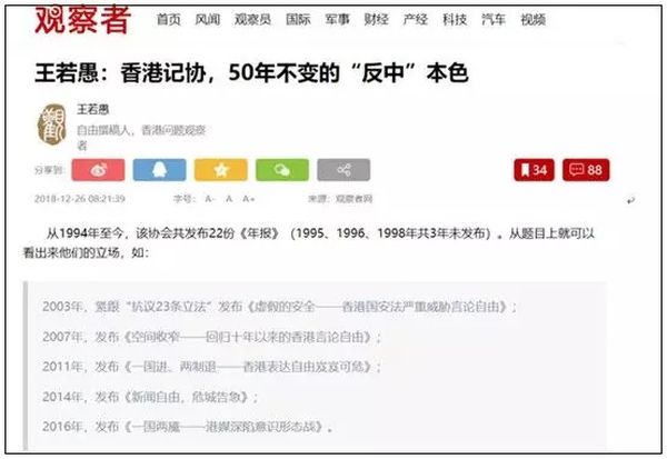 内地媒体观察者网当时也刊登了长文,详细讲述了这个“香港记者协会”的背景,称其在过去50年里一直保持着“反中”的本色,而且每年都会发布一份“妖魔化”香港和内地关系的“年报”。