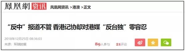 比如去年12月25日,我们《环球时报》就报道过“香港记者协会”竟公然批评香港一家媒体表明自己“反对台独”立场的做法,称这是“自我审查”。