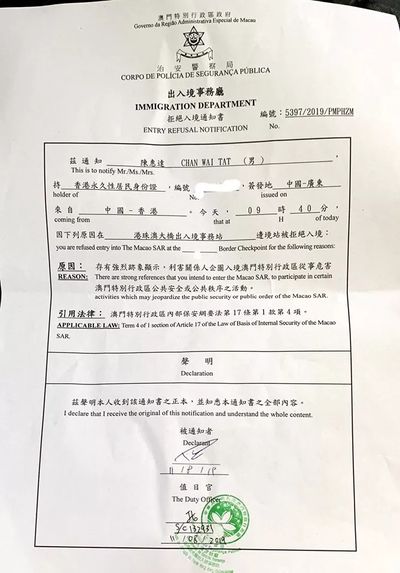 此前,8月11日,香港泛民派议员陈慧达,当天想经过港珠澳大桥前往澳门,但被澳门方面拒绝入境,理由是此人企图危害澳门公共安全或公众秩序。