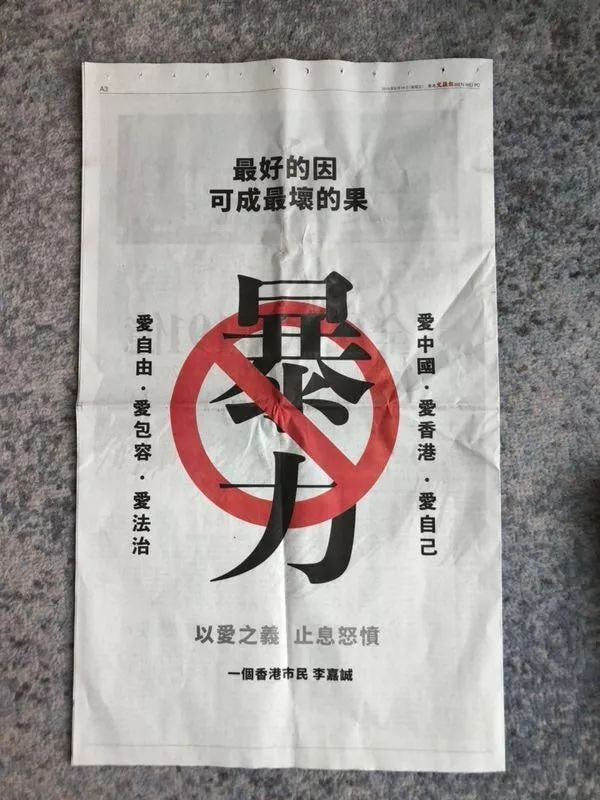 《香港商报》头版刊登的广告正中间是一个红色的禁止标识盖在“暴力”二字之上,左右两边分别写着“爱中国爱香港 爱自己”与“爱自由 爱包容 爱法治”,下方则写有“以爱之义 止息怒愤”,署名是“一个香港市民 李嘉诚”。