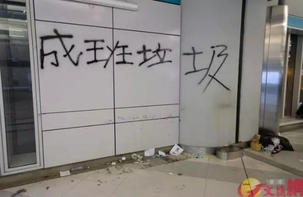 ▲暴徒还趁机在港铁站内喷字涂鸦,港铁职员只能无奈看着暴徒肆意破坏