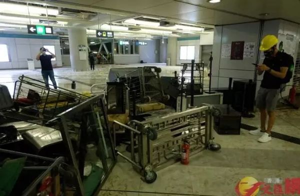 气急败坏的黑衣暴徒开始在大堂内疯狂破坏,包括用雨伞、头盔敲打港铁站内的墙身和天花板,拆毁了站内的环保回收箱、垃圾桶、派报箱、铁马、杂物架以及轮椅等制造路障,在地面淋洒洗洁精及拖消防喉洒水。随后,暴徒又拉下大堂卷闸,并拆掉10多个灭火筒不断喷射,大堂内顿时烟雾弥漫,暴徒则趁机在站内喷字涂鸦。
