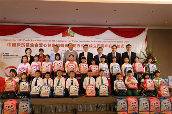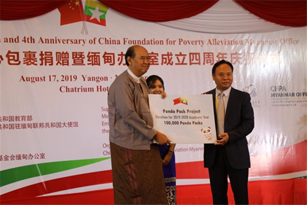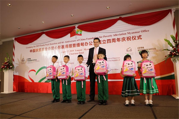 8月17日,中国扶贫基金会缅甸爱心包裹捐赠仪式暨缅甸办公室成立4周年庆祝仪式在仰光举行,中国驻缅甸大使馆杨守征参赞出席并致辞。缅甸教育部副部长温莫吞、中国扶贫基金会副理事长王行最以及仰光达贡大学、仰光第二十八小学、缅甸中国企业商会、媒体界、缅甸各地受助学生代表约二百余人参加。