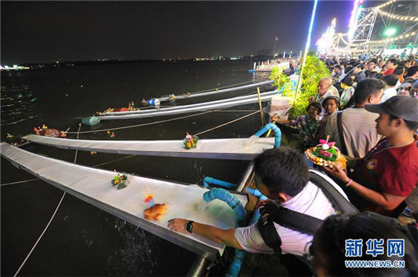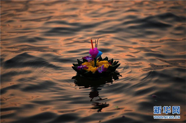11月11日,泰国民众在曼谷周边的湄南河上放水灯。新华社发 (拉亨 摄)