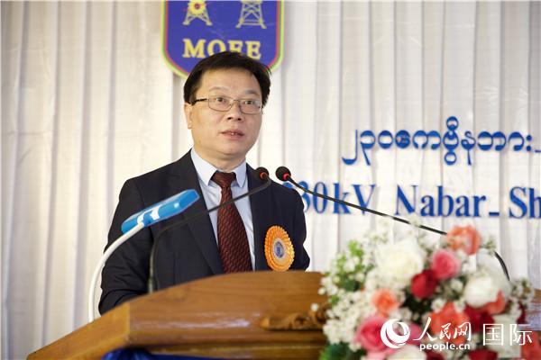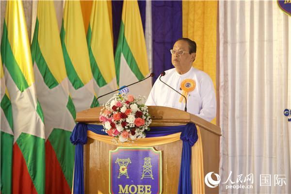 缅甸电力与能源部部长吴温楷在缅甸北克钦邦与230千伏主干网联通工程竣工仪式上发表致辞。孙广勇摄
