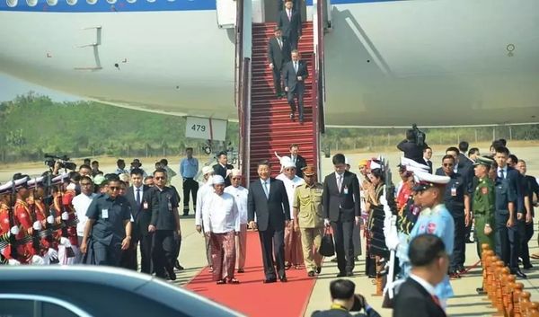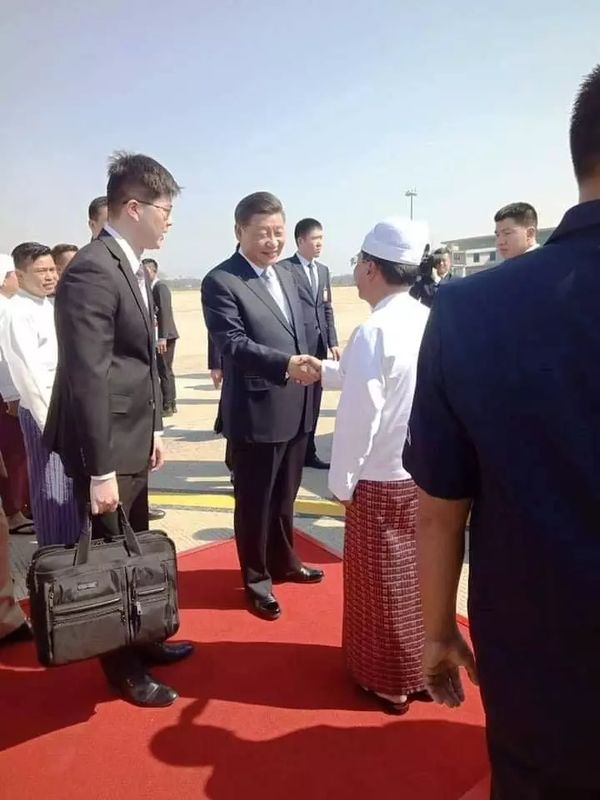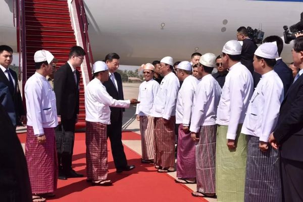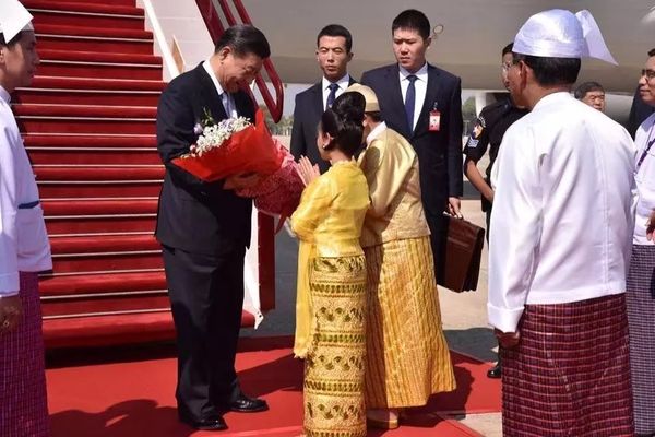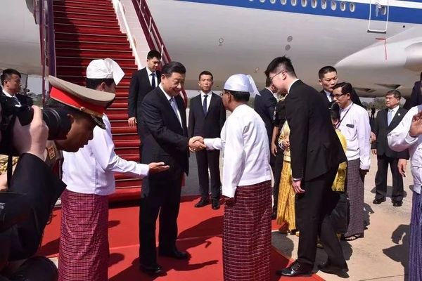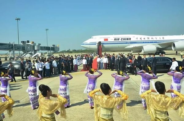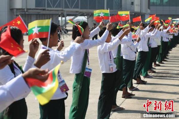 习近平抵达时,缅甸第一副总统敏瑞率多名内阁部长在舷梯旁热情迎接。缅甸少年儿童向习近平献花。身着各民族传统服装的缅甸青年夹道欢迎。礼兵分列红地毯两侧致意。当地艺术家和大学生们表演具有浓郁民族特色的传统歌舞。缅甸青少年挥动中缅两国国旗,用缅文欢呼“中缅友谊万岁”“习主席身体健康”,向习近平表达最诚挚的欢迎。习近平微笑着向他们挥手致意。