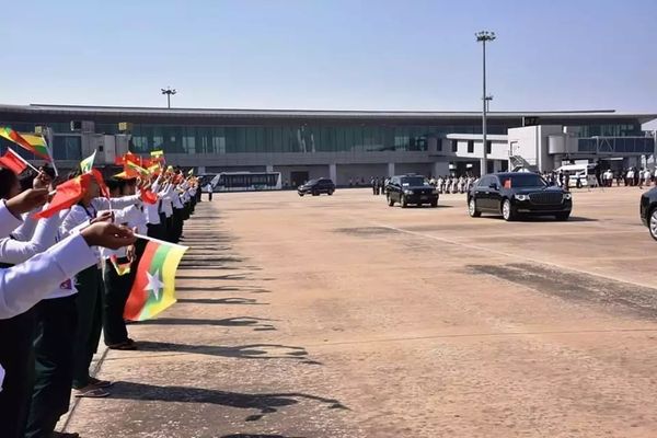 习近平车队离机场前往市区。机场大门上方悬挂着写有“热烈欢迎中国国家主席习近平访问缅甸”“缅甸联邦共和国向中华人民共和国主席习近平阁下致以崇高敬意”的红色横幅。沿途两侧中缅两国国旗迎风飘扬,习近平巨幅肖像和写有“中缅胞波友谊万古长青”“中缅友好合作不断发展”的巨幅标语格外醒目。当地民众载歌载舞,青年学生挥舞两国国旗,以缅甸人民特有的质朴热烈欢迎最尊贵的客人。