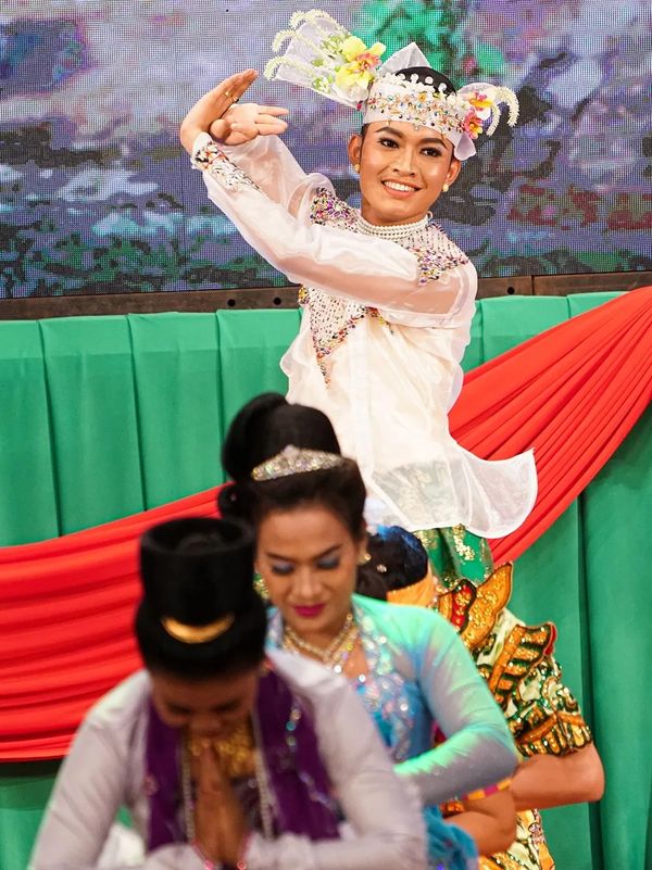 △当地艺术家在机场表演缅甸传统歌舞。
