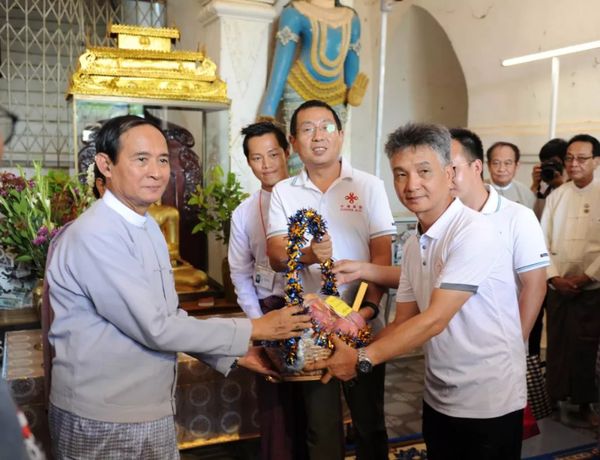 ▲2018年9月,中缅在修复因地震受损的蒲甘佛塔方面的合作正式启动。图为2019年8月3日,缅甸总统温敏(左一)来到蒲甘他冰瑜寺,慰问中方专家及工作组。两国人民自古相亲相融新中国成立后70年的交往合作给两国人民带来了实实在在的利益。