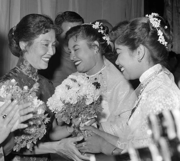 ▲1961年1月6日,中国电影周在仰光总统电影院举行开幕式。图为缅甸电影演员向中国电影演员张瑞芳(左)献花。