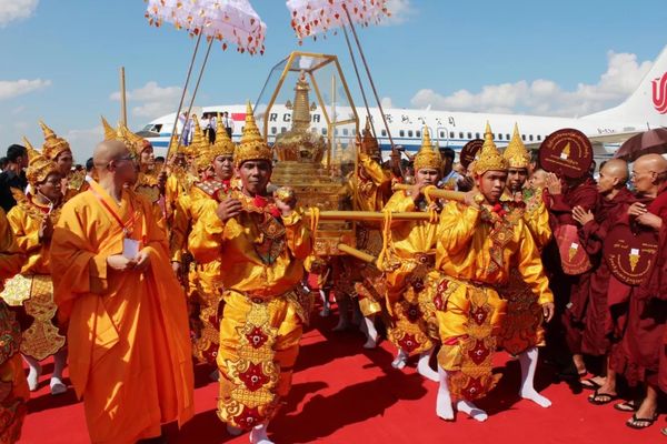▲2011年11月6日,北京西山灵光寺佛牙舍利塔中供奉的佛牙舍利抵达内比都机场,开始为期48天的缅甸供奉巡礼。
