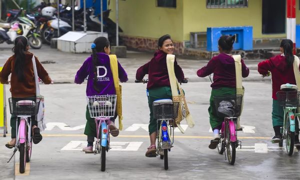 ▲国境线将云南省瑞丽市姐相乡一个村寨一分为二,中方一侧称银井,缅方一侧称芒秀,是典型的“一寨两国”村落。 图为银井小学几位缅籍学生骑车回家,跨过银井边防口岸国境线。