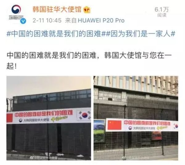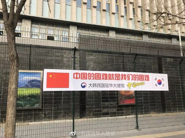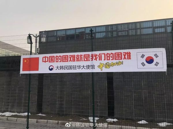 韩国驻华使馆打出横幅:中国的困难就是我们的困难,中国加油!