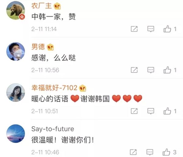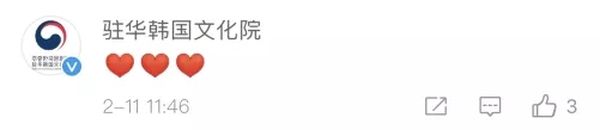 韩国驻华大使馆给中国加油鼓劲,驻华韩国文化院也为此点赞。↓