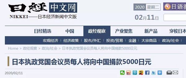 据《日本经济新闻》报道,日本执政党自民党的干事长二阶俊博在2月10日干部会议后的记者会上表示,针对在中国发生的新冠肺炎疫情,自民党将向中国提供支援资金。他宣布自民党内的国会议员每人将向中国捐款5000日元。