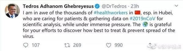 9日,谭德塞通过社交媒体向抗击新冠肺炎疫情的中国医护人员致敬。他说:“全世界感激你们为找到最好的治疗办法和防止病毒蔓延所作的努力。”