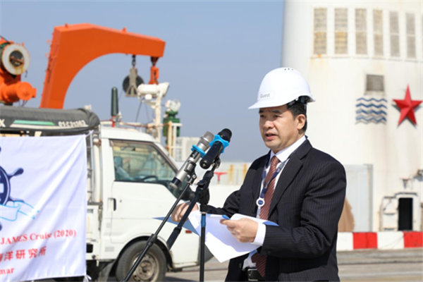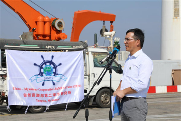 中国“向阳红06”科考船首席科学家周峰介绍了此次科学考察的有关安排,并对缅方登船科学家表示欢迎。