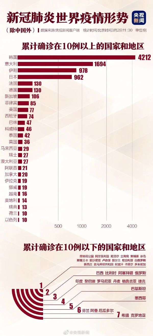 据世卫组织统计,截至北京时间3月2日17时,中国境外共64个国家确诊新冠肺炎8774例,死亡共计128例。与前一日报告相比,新增病例1598例。
