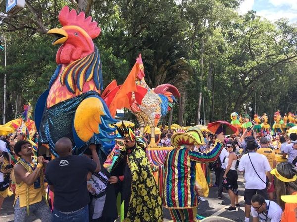 ▲一年一度的巴西狂欢节于当地时间2月21日晚开幕,巴西各大城市进入了“狂欢节时间”。图为圣保罗民众推着大型吉祥物“公鸡”参加街头狂欢活动。(中新社记者 莫成雄 摄)