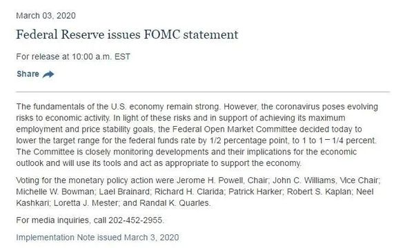 3月3日,美联储宣布大幅降息50个基点,将联邦储备基金利率目标区间降至1%-1.25%。