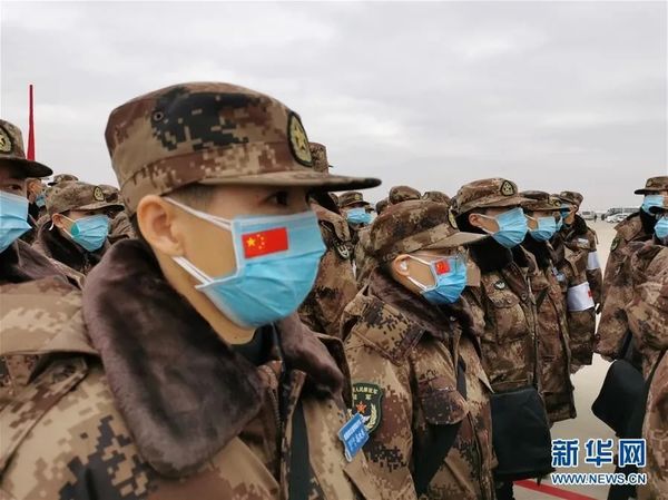 ▲2月13日,一批增援武汉的军队医护人员抵达武汉天河机场,队员们口罩上贴着中国国旗。(新华社记者 黎云 摄)