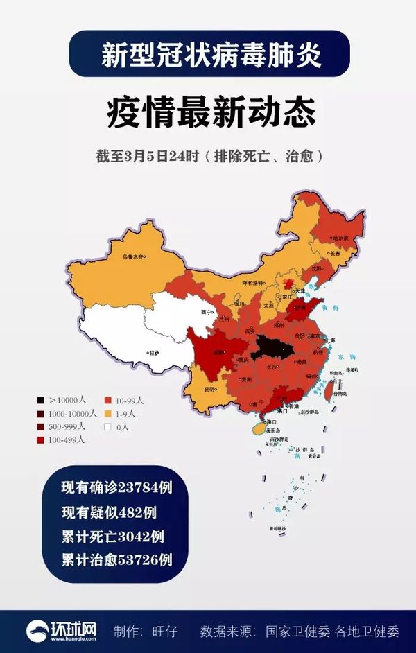 截至3月5日24时,据31个省(自治区、直辖市)和新疆生产建设兵团报告,现有确诊病例23784例(其中重症病例5737例),累计治愈出院病例53726例,累计死亡病例3042例,累计报告确诊病例80552例,现有疑似病例482例。累计追踪到密切接触者670854人,尚在医学观察的密切接触者29896人。