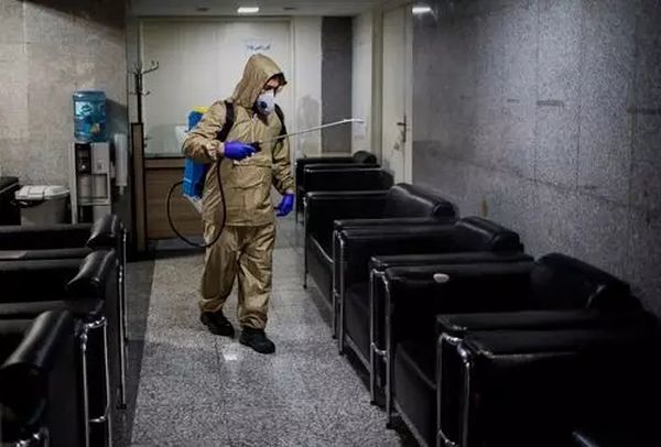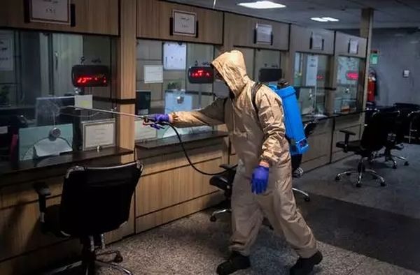 ▲3月7日,在伊朗德黑兰的伊朗卫生部,一名工作人员在进行消毒。(新华社发 艾哈迈德·哈拉比萨斯 摄)