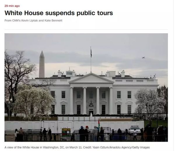 据美国有线电视新闻网(CNN)刚刚快讯,美国白宫宣布暂停对公众开放。美国国会大厦、参众两院大楼也将对公众关闭至4月1日。
