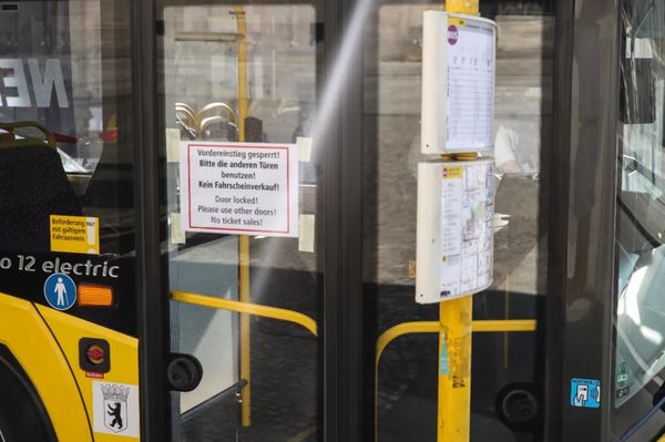 3月16日,在德国柏林,一辆公交车上张贴着禁止乘客从前门上车避免与司机接触的告示。新华社记者单宇琦摄