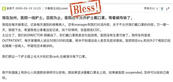 我刚看到这边华人论坛上一个护士的哭诉,她们的领导不让护士们戴口罩,原因是怕引起民众的恐慌……