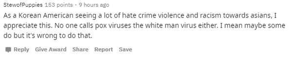 对于盖茨的说法,不少网友表示赞同。一位网友称,“作为一名韩裔美国人,我看到很多针对亚洲人的仇恨犯罪、暴力和种族主义(攻击),我很欣赏(盖茨)说的。也没有人将痘病毒(pox virus)称为白人病毒。我是说,也许有些人是这样做的,但这样做是错误的。”