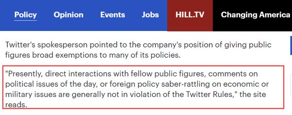 而在推特看来,他们则认为赵立坚的行为本身并没有违反推特的规则,称“目前,直接与其他公众人物互动,评论热点政治议题,或是在经济或军事问题上进行外交上的口水战,通常来说并不违反推特的规则”。