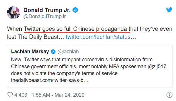 不过,尽管推特在此事上看似在坚守他们的原则和底线,他们却遭到了一些美国政客和媒体的猛烈抨击。其中,特朗普的儿子就发帖攻击推特成为了中国政府的宣传工具。