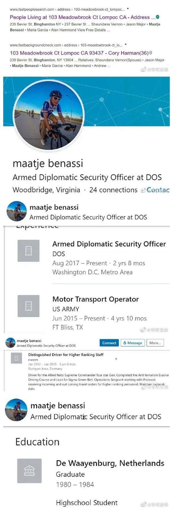 近日,有美国人在“YouTube”上发布一段视频,声称他们4名在美国弗吉尼亚州的老外(3名美国人,1名加拿大人)成功追溯到了新冠肺炎的“0号病例”——美国女军官Maatja Benassi!