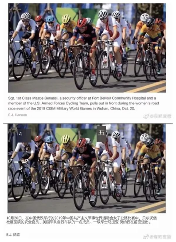 下面这张老七直接翻译后截图,当时美国媒体的报道很清楚:这名女军官在10月20日参加武汉军运会自行车比赛,而且是退出。