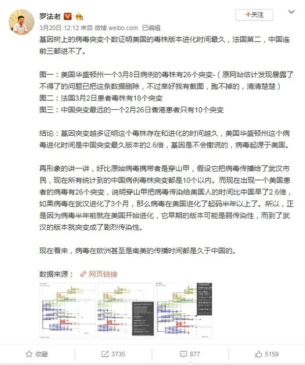 其实关于“如果病毒起源于美国,为什么看上去美国爆发的比中国要晚”这个问题及病毒的来源、变异,在3月20日就有人通过美国的数据得出一个结论:
