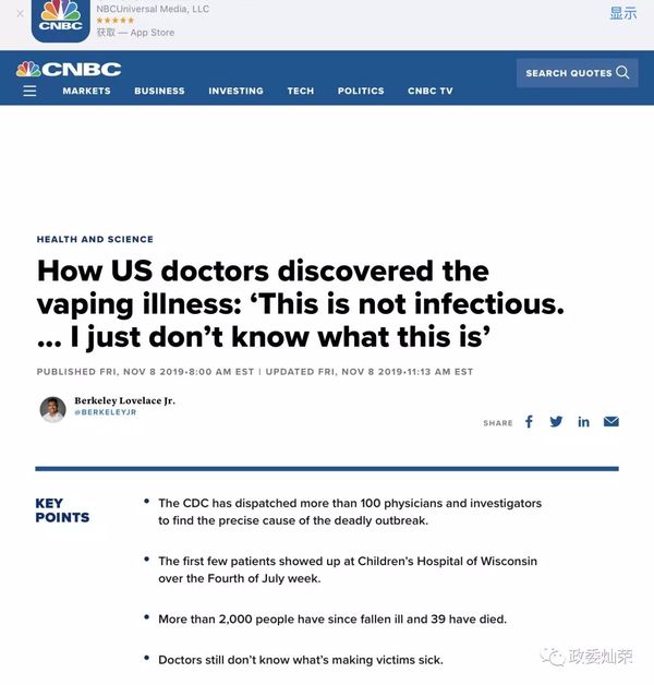 2019年11月8日,“CNBC”报道称,已有超过2000人患上“电子烟肺炎”,39人死亡。
