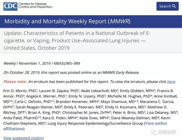 2019年10月4日,“华盛顿邮报”报道称,美国疾控中心已收到1080例的与“电子烟有关的肺炎”报告,其已致18人死亡。(笔者注:此时全美媒体几乎都不再使用“神秘肺炎”一词,转而使用“与电子烟有关的肺炎”或“电子烟导致的肺炎”;该链接现已无法访问)