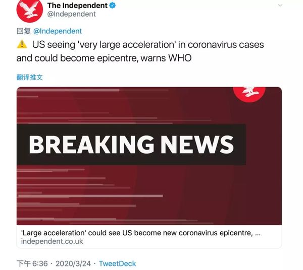 《独立报》认为,美国可能将超过意大利的病例数。报道还提到,有关机构也暗示美国还有望最终超过中国的近8.2万例感染病例。