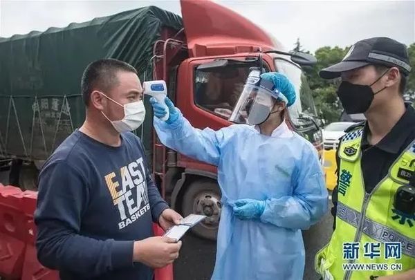 3月26日,在武汉北高速收费站交通卡点,工作人员对乘车人员进行测温。新华社记者 肖艺九 摄