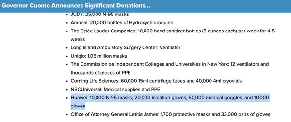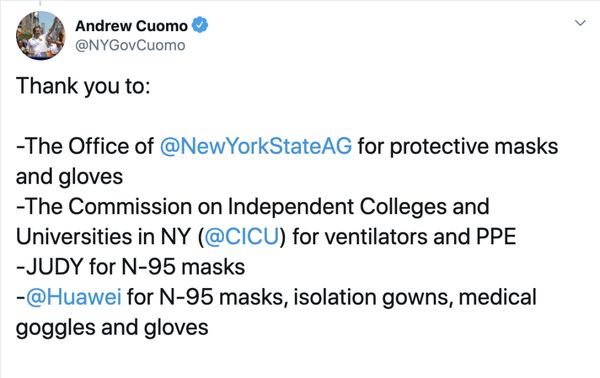 3月27日,纽约州州长安德鲁·科莫在政府官网发文称,已收到众多大型公司、慈善组织和名人慷慨捐款。在附上的捐赠清单中有高盛、脸书、欧莱雅等,其中还包括华为。科莫州长随后还在推特上再次点名感谢华为。