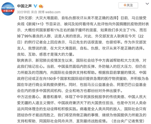 日前,马云接受央视《新闻1+1》节目采访,被问及如何看待有人批评他向外国捐赠抗疫物资时表示,大概任何国家都有1%左右的脑子撞坏的混蛋,如果我们多关注了1%,而忘掉了99%善良的人群,这是人类的悲哀。对此,外交部发言人耿爽在今天(22日)的例行记者会上回应表示,马云先生的话很直接,也很坦率。作为外交部发言人,我想说的是,在大灾大难面前,自私、仇恨、攻讦从来不是正确的选择。良知、互助、感恩才是强大的力量。