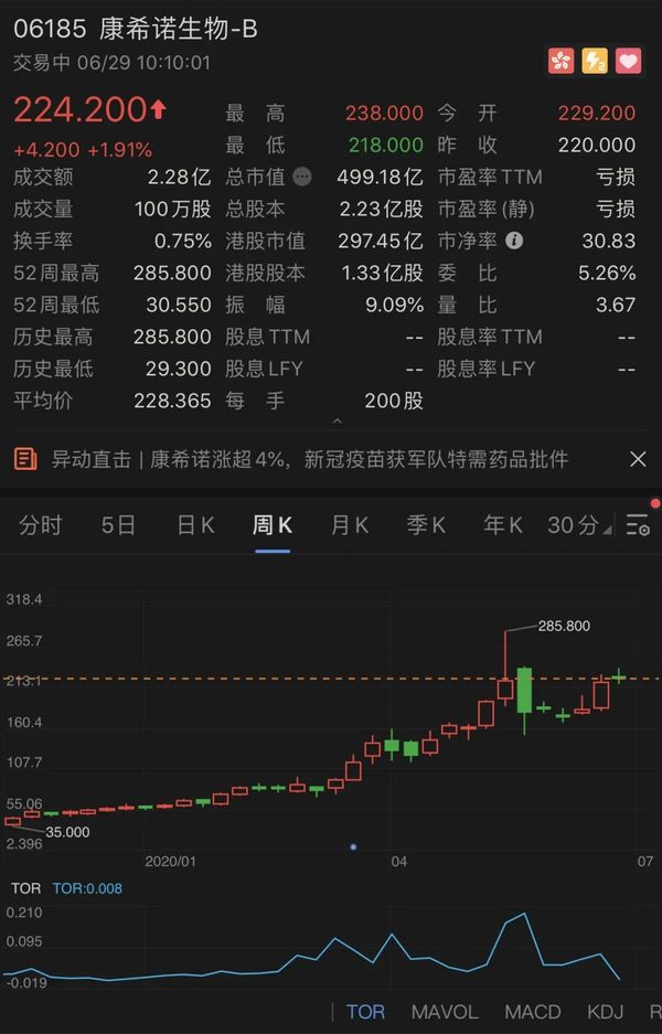 今天港股开盘,康希诺生物-B高开4.2%,盘中最高涨幅达8%,截至发稿,涨幅回落至3.2%,市值505亿港元。今年以来,其股价涨幅高达284%。